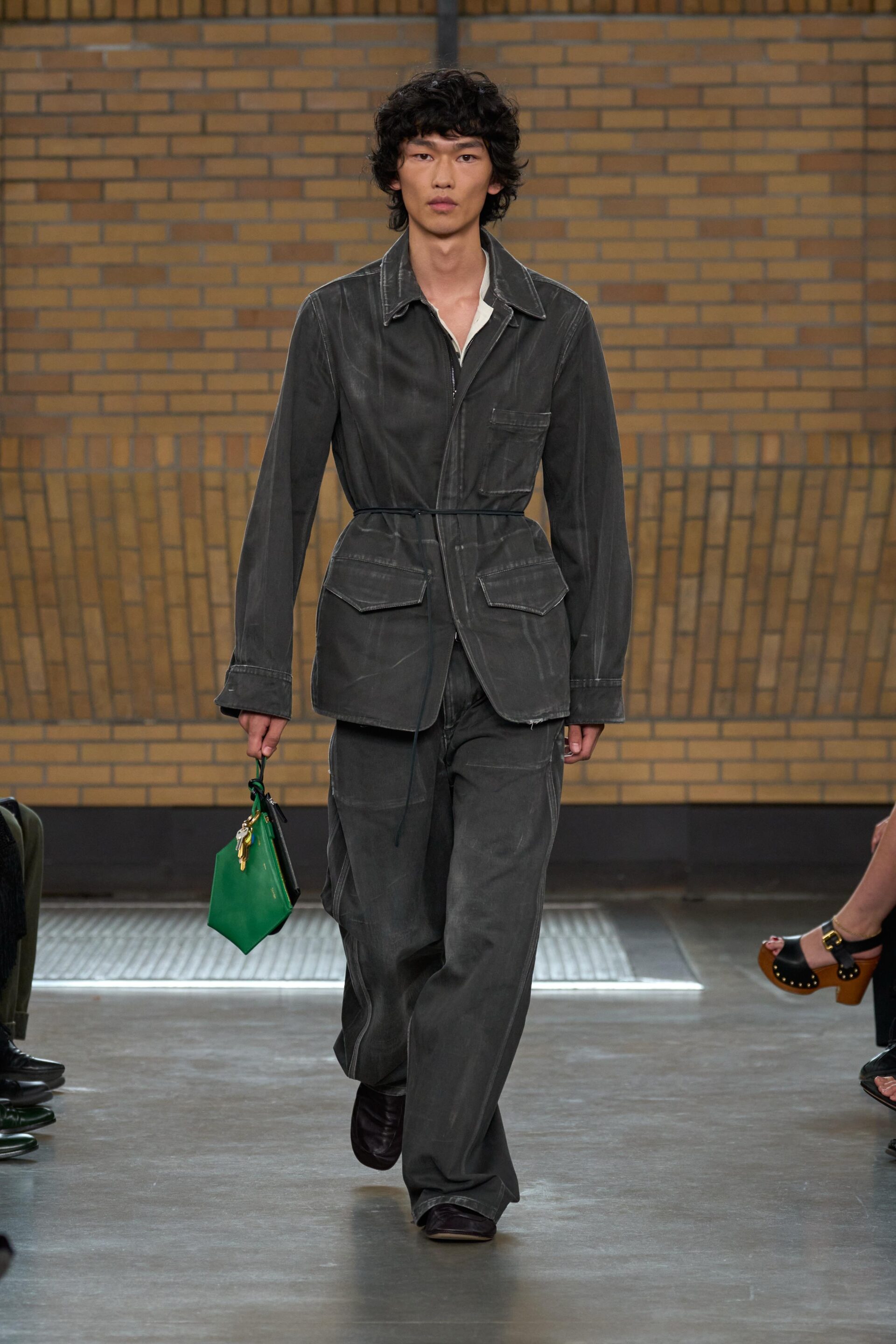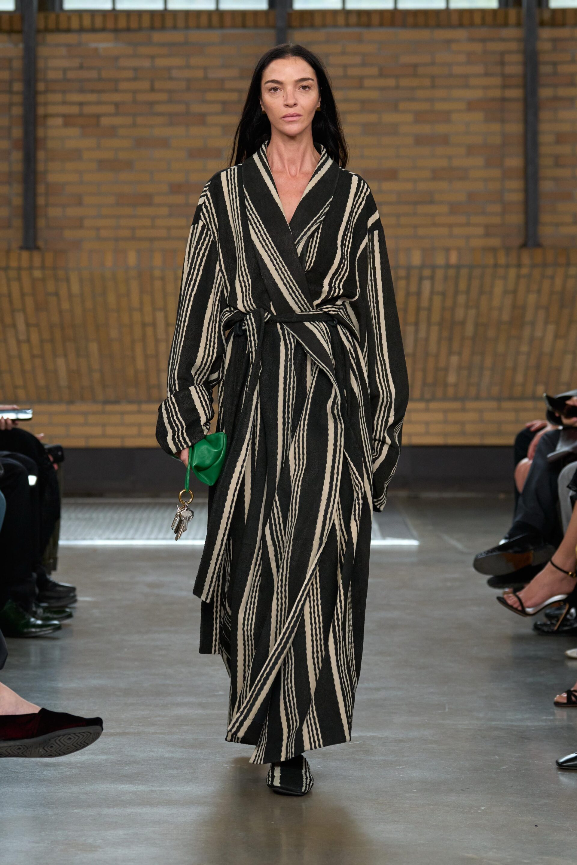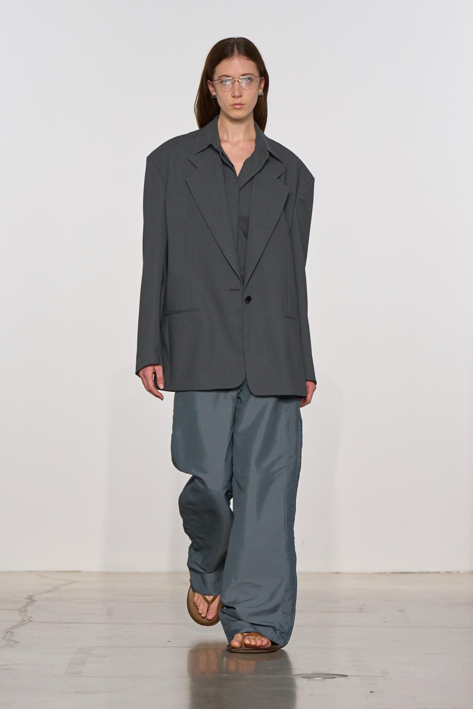 La ropa interior se convierte en protagonista, apareciendo en variaciones de la camiseta lencera y el vestido lencero, en detalles de encaje y correas para gafas, para luego estallar en un vestido de tweed sin costuras tejido con las icónicas bandas de cintura con logo de la marca. En la ropa, las siluetas van desde altas y esbeltas hasta cortas y reveladoras, pasando por sueltas y en capas, con un enfoque en la sastrería precisa, los drapeados fluidos y los detalles de flecos. Lanas a medida, tejidos técnicos lavados y encerados, jerséis y sedas líquidas se ofrecen en una paleta urbana de blancos, negros y grises, con toques de rosa, escarlata, azul claro y verde helecho. Los tejidos, especialmente los cueros, adoptan nuevas texturas táctiles: cortados con láser para parecer felpa, ensamblados en intarsia, cortados a mano y tejidos en vestidos de flecos al crochet.