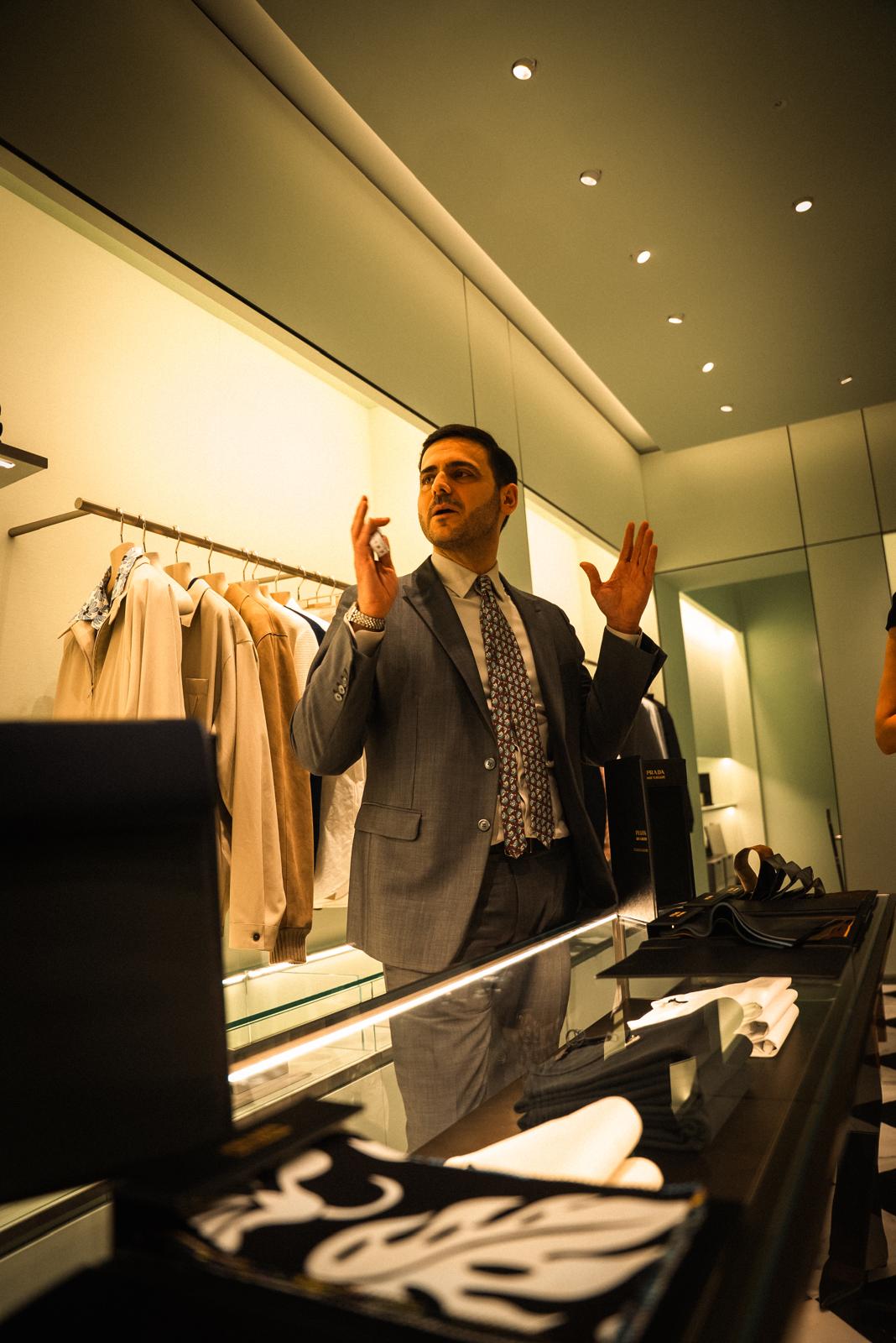 Para esta ocasión especial, se contó con la presencia de Gennaro Trematerra, Prada Uomo MTM Manager para el Sur y Norte de Europa, quien ofreció una interesante charla sobre los exclusivos servicios de personalización de la marca. Durante su intervención, Trematerra presentó una cuidada selección de pieles finas y exquisitas telas de seda, elementos que reflejan la esencia de la nueva colección masculina de Prada.