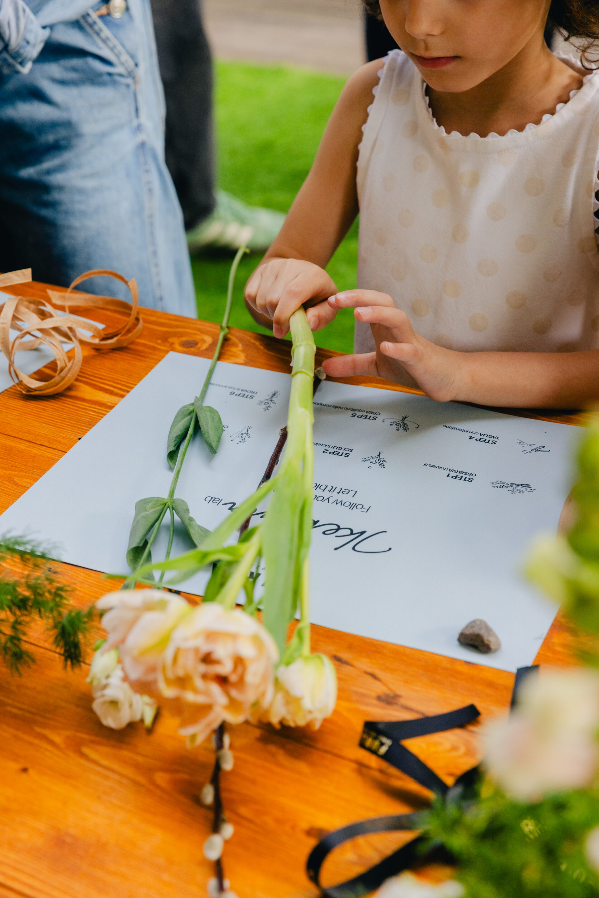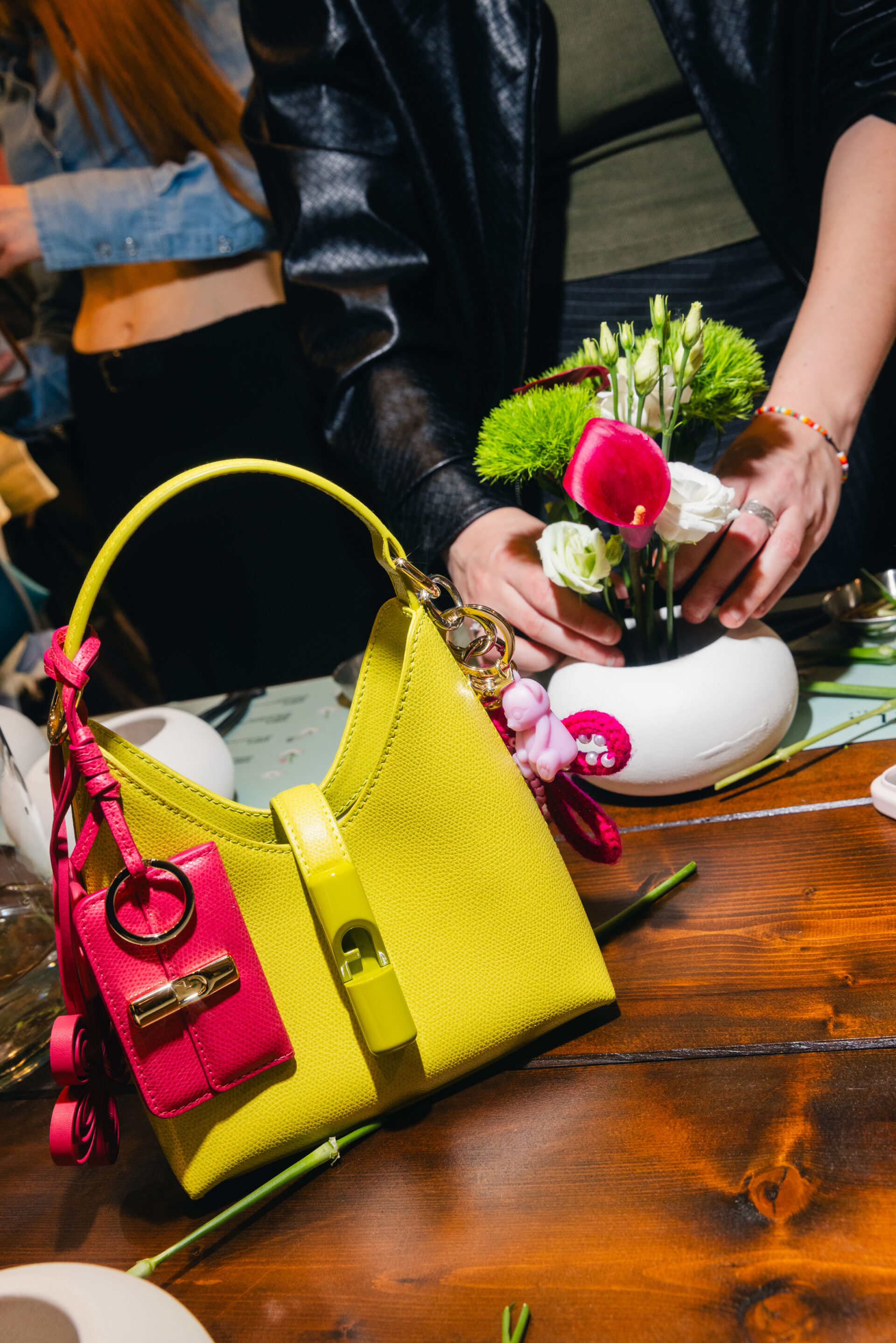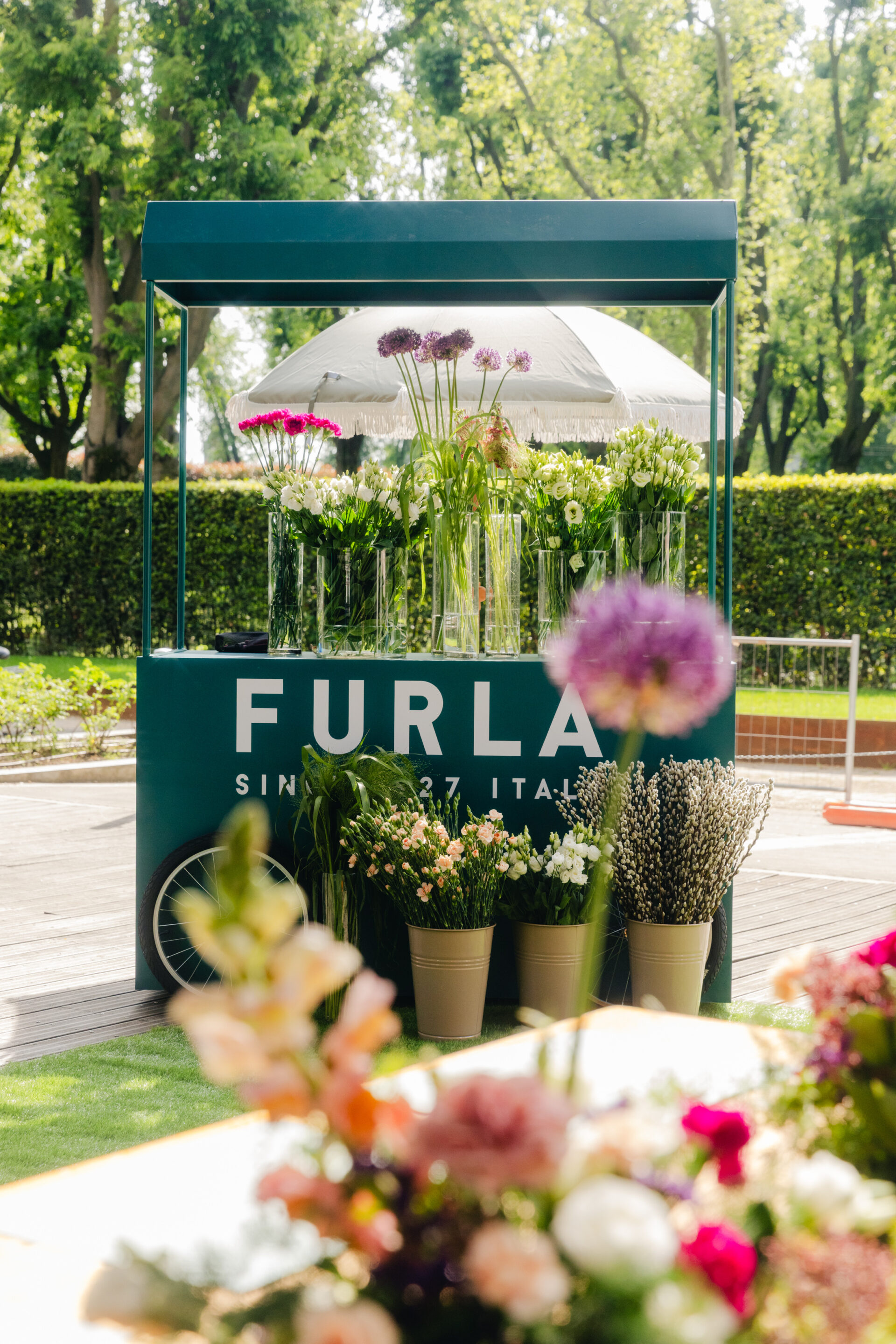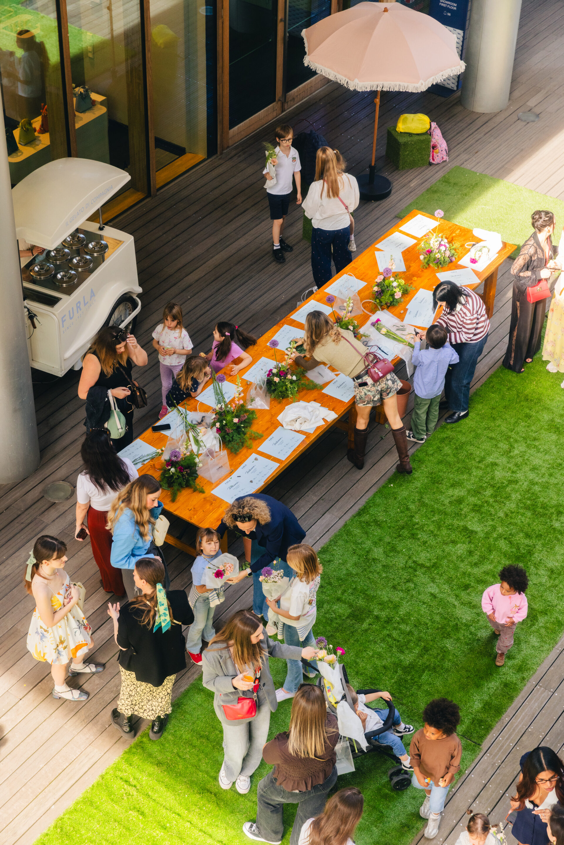 La jornada comenzó con un primer momento totalmente dedicado al público: una experiencia diseñada para madres e hijos, quienes fueron invitados a crear juntos sus propias composiciones de ikebana dentro de un entorno inmersivo, lúdico y colorido. Sombrillas de colores vivos, pufs verdes y carritos vibrantes que ofrecían aperitivos, polos helados y flores crearon un ambiente acogedor y creativo que reflejaba plenamente el espíritu lúdico de Furla, basado en la inclusión, la alegría y la conexión.