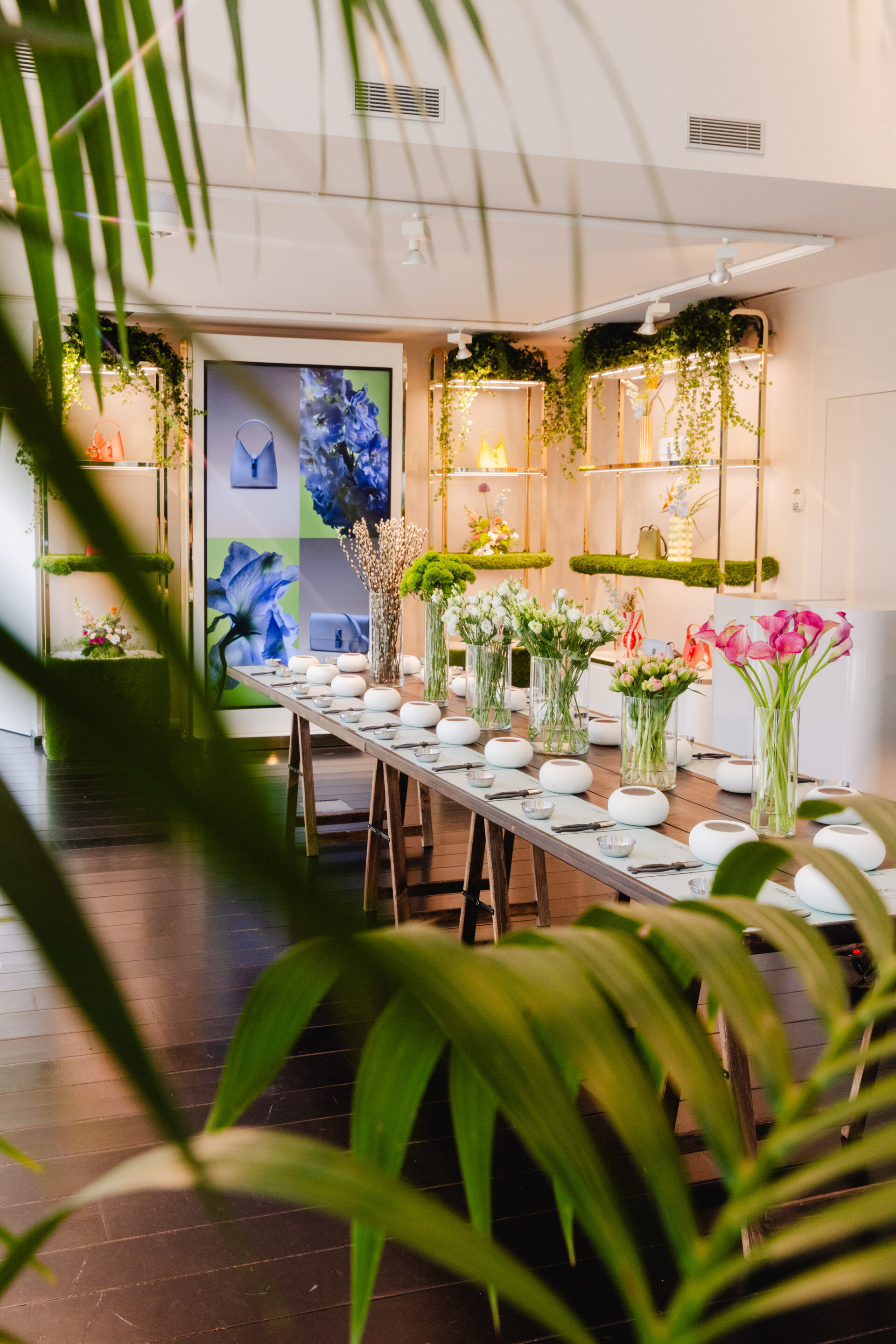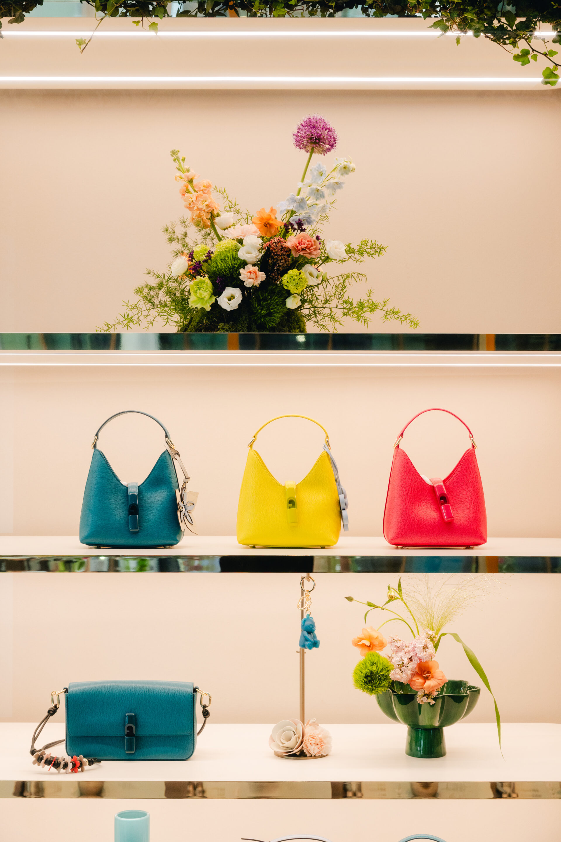 Las composiciones florales interactuaban con los tonos audaces y luminosos de los icónicos bolsos de la marca, como el Iride Bag y el Roxie bucket, presentados en tonos como Aperitivo Orange, Velvet Pink, Museum Yellow y Amatore Blue, creando un refinado juego de contrastes y armonías visuales.