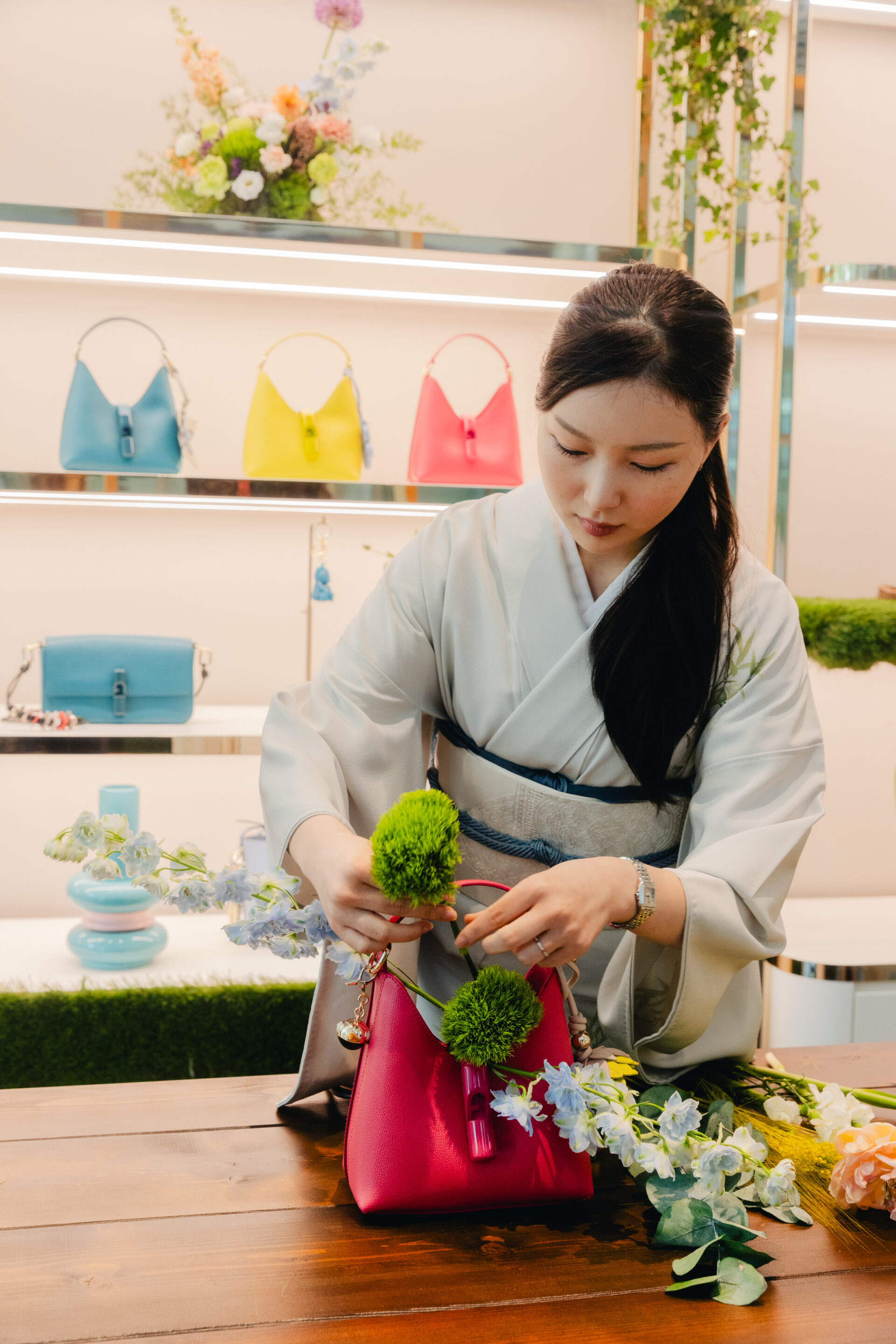 Furla abrió las puertas de su showroom en Via Tortona 37 en Milán para un evento especial que reunió moda, arte y naturaleza a través del delicado lenguaje de las ikebanas, el ancestral arte japonés de arreglo floral, donde el equilibrio, la armonía y la intención dan forma a cada creación.
